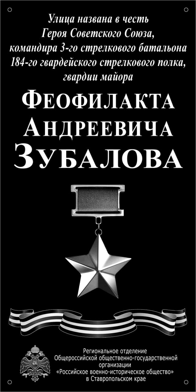 В рамках реализации проекта «Историческая память Ставрополья» Региональное отделение Российского военно-исторического общества в Ставропольском крае (РО РВИО СК) установило в городе-курорте Пятигорске мемориальную доску на улице, названной в честь Героя Советского Союза Ф.А. Зубалова. Проект реализуется при поддержке Министерства молодежной политики Ставропольского края.