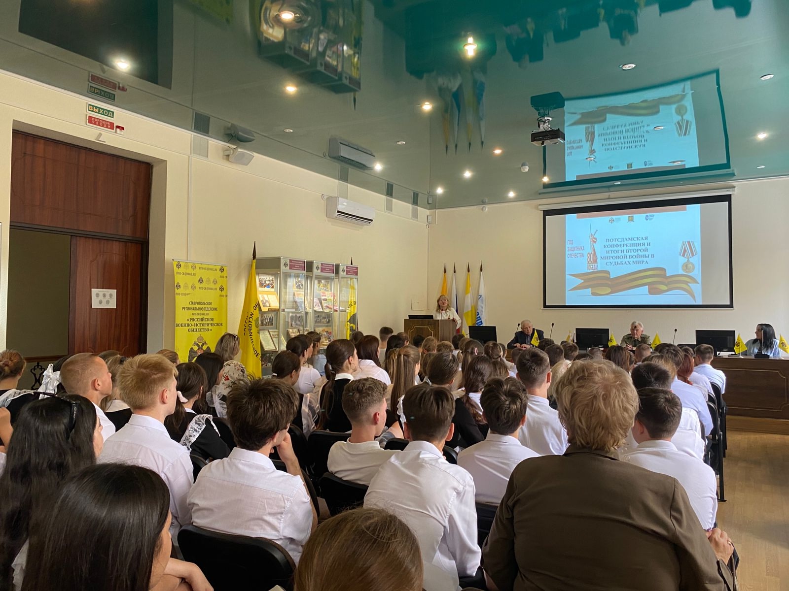 Так, 3 сентября 2025 года в конференц-зале РО РВИО СК состоялся круглый стол «Потсдамская конференция и итоги Второй мировой войны в судьбах мира». Мероприятие было подготовлено РО РВИО СК совместно с отделом военной истории и патриотической работы Ставропольского государственного музея-заповедника (СГМЗ). Участниками мероприятия стали Басулин Г.Е., сын Героя Советского Союза, летчика-истребителя Басулина Е.Д. (1917-1957 гг.); Лачиянц Т.В., член Регионального исполнительного комитета Ставропольского регионального отделения Партии «Единая Россия»; учащиеся и педагоги образовательных учреждений г. Ставрополя. Вместе с лекторами Судавцовым Н.Д., д.и.н., Почетным профессором Северо-Кавказского федерального университета (СКФУ), главным научным сотрудником отдела военной истории и патриотической работы СГМЗ, членом-учредителем РО РВИО СК, и Стрекаловой Е.Н., к.и.н., доцента кафедры истории России СКФУ, старшим научным сотрудником отдела военной истории и патриотической работы СГМЗ, членом РО РВИО СК, школьники обсудили роль СССР в победе над Японией и окончании Второй мировой войны, рассмотрели вопросы, поднятые на Потсдамской конференции, узнали о ставропольцах, внесших весомый вклад в победу над Японией.