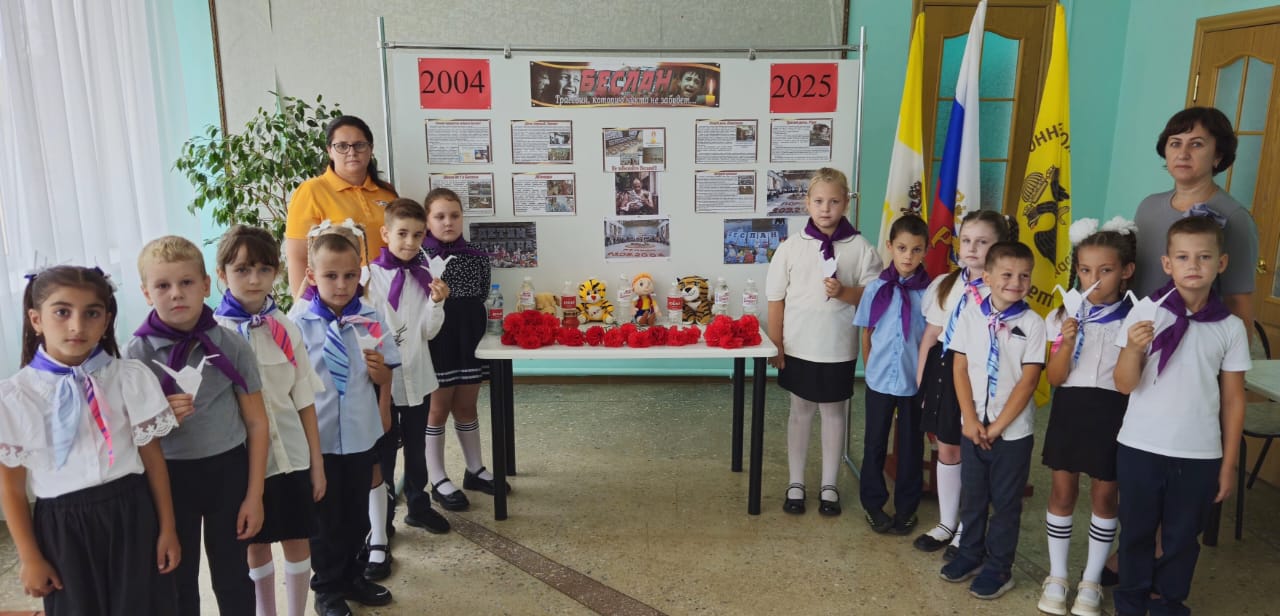 В Новоалександровском районном музее прошёл урок «И плакал дождь холодными слезами…», посвящённый 21-й годовщине памяти погибших в результате теракта в Беслане 1–3 сентября 2004 г. Мероприятие было организовано сотрудниками музея Герасимовой М.Ф. и Скрипниковой Л.А., членами РО РВИО СК. Участниками мероприятия стали учащиеся 8А класса МОУ лицей «Экос» г. Новоалександровска.