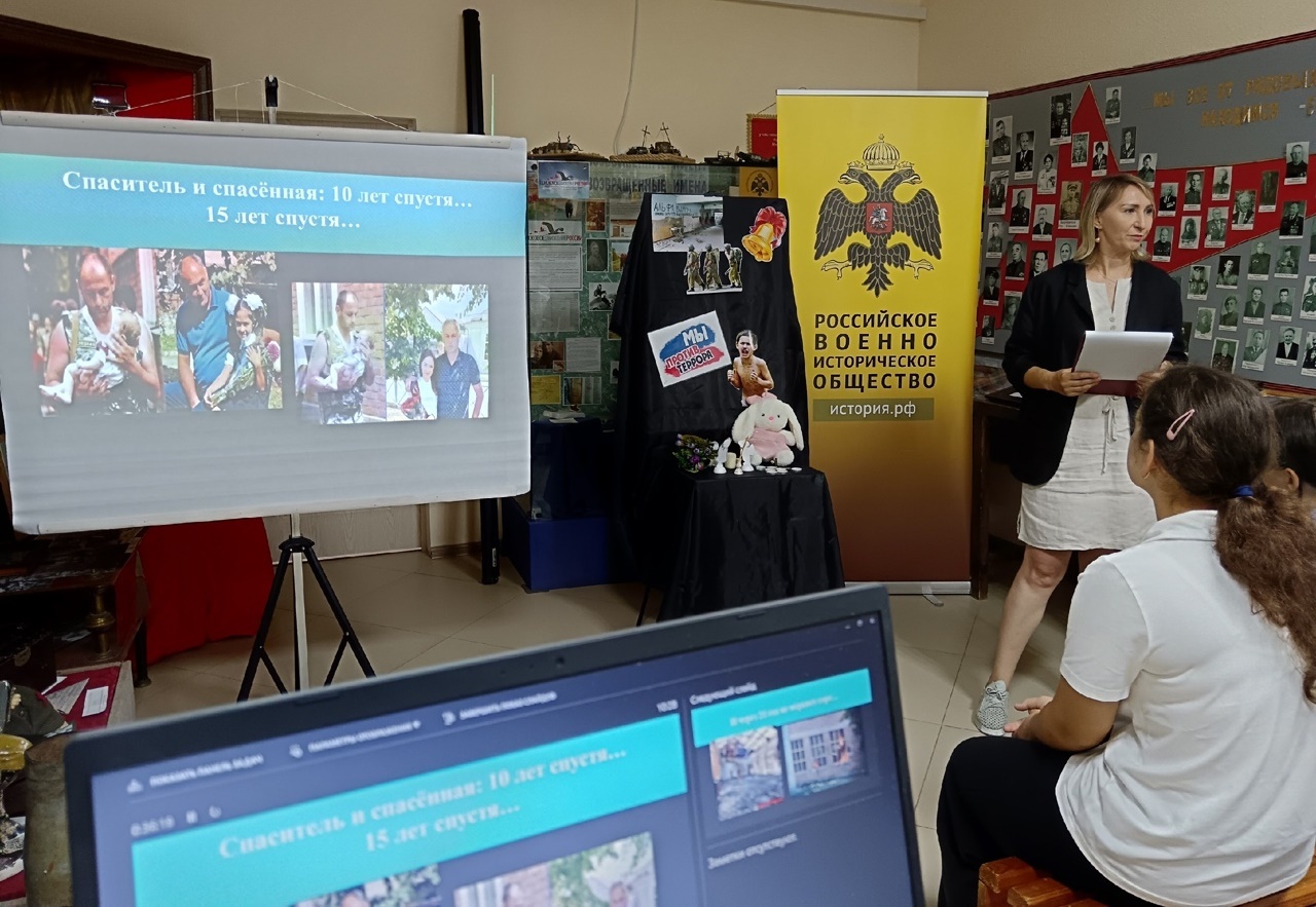 В этот день для обучающихся МКОУ СОШ №1 ст. Курской Балахтиной А.В., директором кинотеатра «Восток», членом Местного отделения РО РВИО СК в Курском муниципальном округе (председатель – Жулина Г.В.), был организован показан документального фильма «Герои. Честные истории». Кинолента была создана при поддержке РВИО. В ней раскрываются четыре истории о героях нашей Родины, один из которых – участник событий в Беслане.