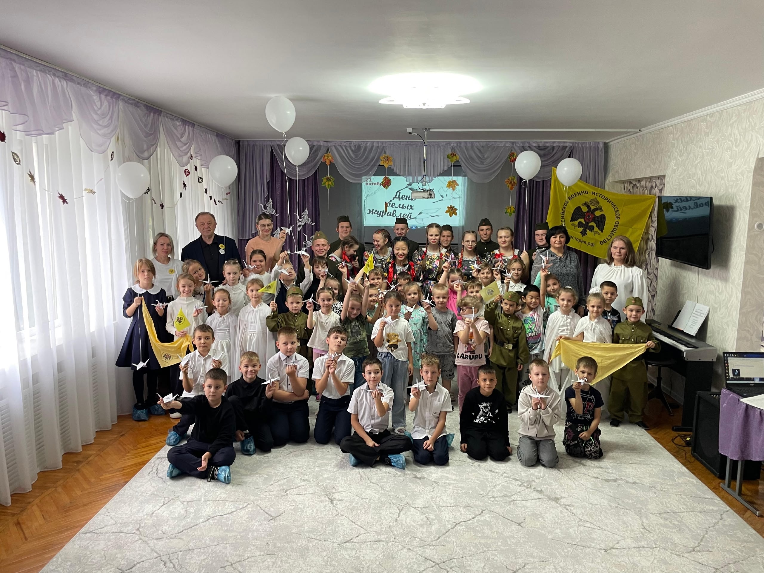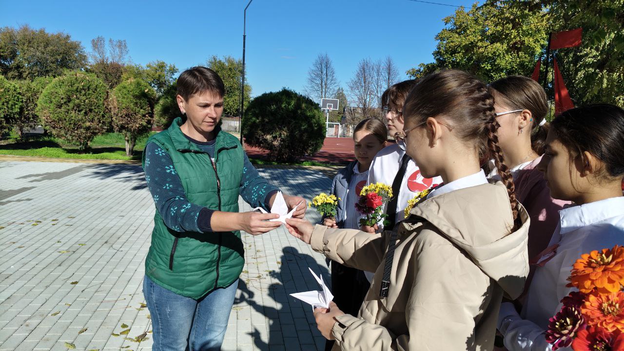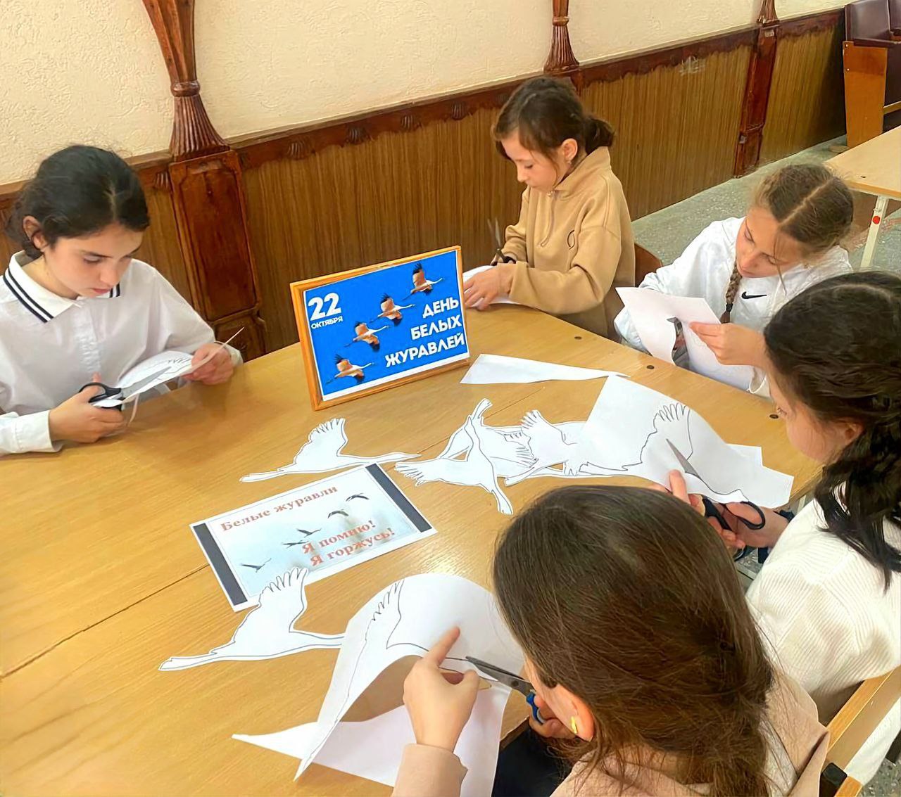 22 октября 2025 г. в МБОУ СОШ №8 имени А.В. Грязнова с. Тищенского (директор – Князева С.С., член РО РВИО СК) на базе историко-краеведческого музея «Истоки» №7315 имени М.Ф. Гусева (руководитель музея – Мирошниченко Т.Н., член РО РВИО СК) прошёл урок, посвящённый Дню белых журавлей. Школьники узнали об истории праздника, трагической судьбе японской девочки Садако Сасаки и услышали песню «Журавли» в исполнении Марка Бернеса. Кульминацией мероприятия стала акция, в рамках которой ребята написали на бумажных журавликах имена своих родных, погибших в Великой Отечественной и других войнах, и разместили их на стенде в виде журавлиного клина. Журавликов, сделанных в технике оригами, школьники раздали односельчанам, чтобы напомнить о памятной дате. Завершилось мероприятие возложением цветов к мемориалу «Вечный огонь» и минутой молчания.