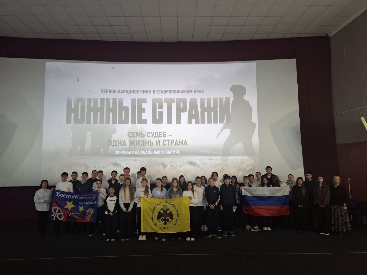 Для учеников МКОУ СОШ №1 ст. Курской был организован показ документального фильма «Южные Стражи». Мероприятие состоялось по инициативе директора кинотеатра «Восток» Балахтиной А.В., члена Местного отделения РО РВИО СК в Курском муниципальном округе (председатель – Жулина Г.В.). «Южные стражи» – уникальный кинопроект, созданный на Ставрополье. В основе сценария – непридуманные истории бойцов, добровольцев, волонтёров и их родных, которые разворачиваются на фоне событий Специальной военной операции.