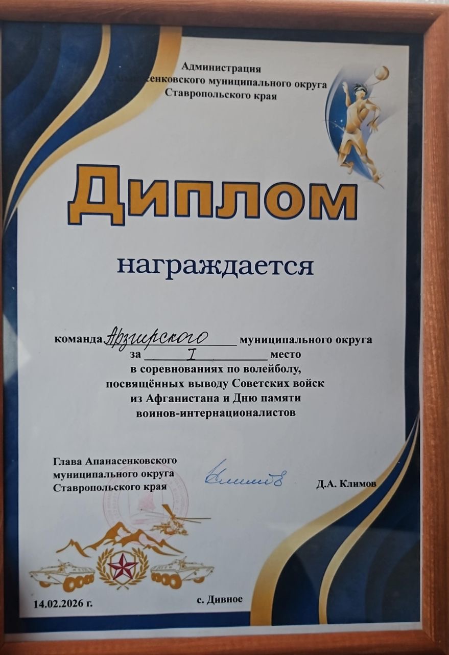 14 февраля 2026 г. состоялся кубок по волейболу, посвящённый 37-й годовщине вывода ОКСВ из Афганистана. В чемпионате, который прошёл в Аппанасенковском муниципальном округе, приняла участие команда с. Родниковского (капитан команды – Гапизов М.Г., член Местного отделения РО РВИО СК в с. Родниковском (председатель – Новак Н.Н.)), представившая Арзгирский округ. По итогам розыгрыша команда родниковцев заняла 1 место. Поздравляем команду с очередной заслуженной победой!