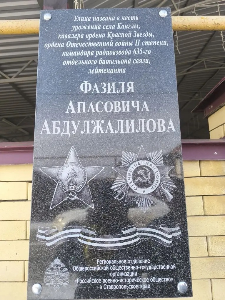 Ещё одно памятное мероприятие состоялось в с. Канглы у мемориальной доски лейтенанту Ф.А. Абдулжалилову. Уроженец села, кавалер ордена Красной Звезды и ордена Отечественной войны II степени, командовал радиовзводом 635-го отдельного батальона связи. Памятный знак был установлен на улице, носящей его имя, в 2025 г. по инициативе РО РВИО СК в рамках проекта «Историческая память поколений» при поддержке Министерства молодёжной политики Ставропольского края.
