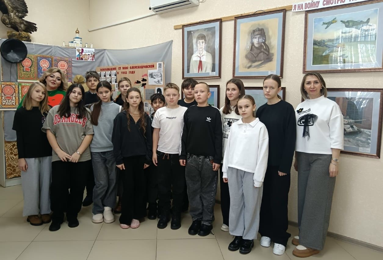 С 15 января по 31 января 2026 г. в Новоалександровском районном музее проходят экскурсии для учащихся школ района по выставкам, приуроченным к 83-й годовщине освобождения Новоалександровского района от немецко-фашистских захватчиков – «Освобождение станицы Ново-Александровской в 1943 году» и «Я на войну смотрю глазами деда», на которой представлены картины воспитанников Детской художественной школы (ДХШ) г. Новоалександровска на военную тематику. Эти выставки стали уже традиционными в январе. Одними из первых их посетили учащиеся 6 класса МОУ СОШ №4 пос. Темижбекского. С особым интересом ребята слушали рассказ сотрудников музея, членов РО РВИО СК Герасимовой М.Ф. и Скрипниковой Л.А. о периоде оккупации и об освобождении станицы Ново-Александровской в 1942-1943 гг. Были представлены свидетельства и воспоминания очевидцев тех событий, фотографии героев-освободителей и сведения о братских захоронениях района и г. Новоалександровска.