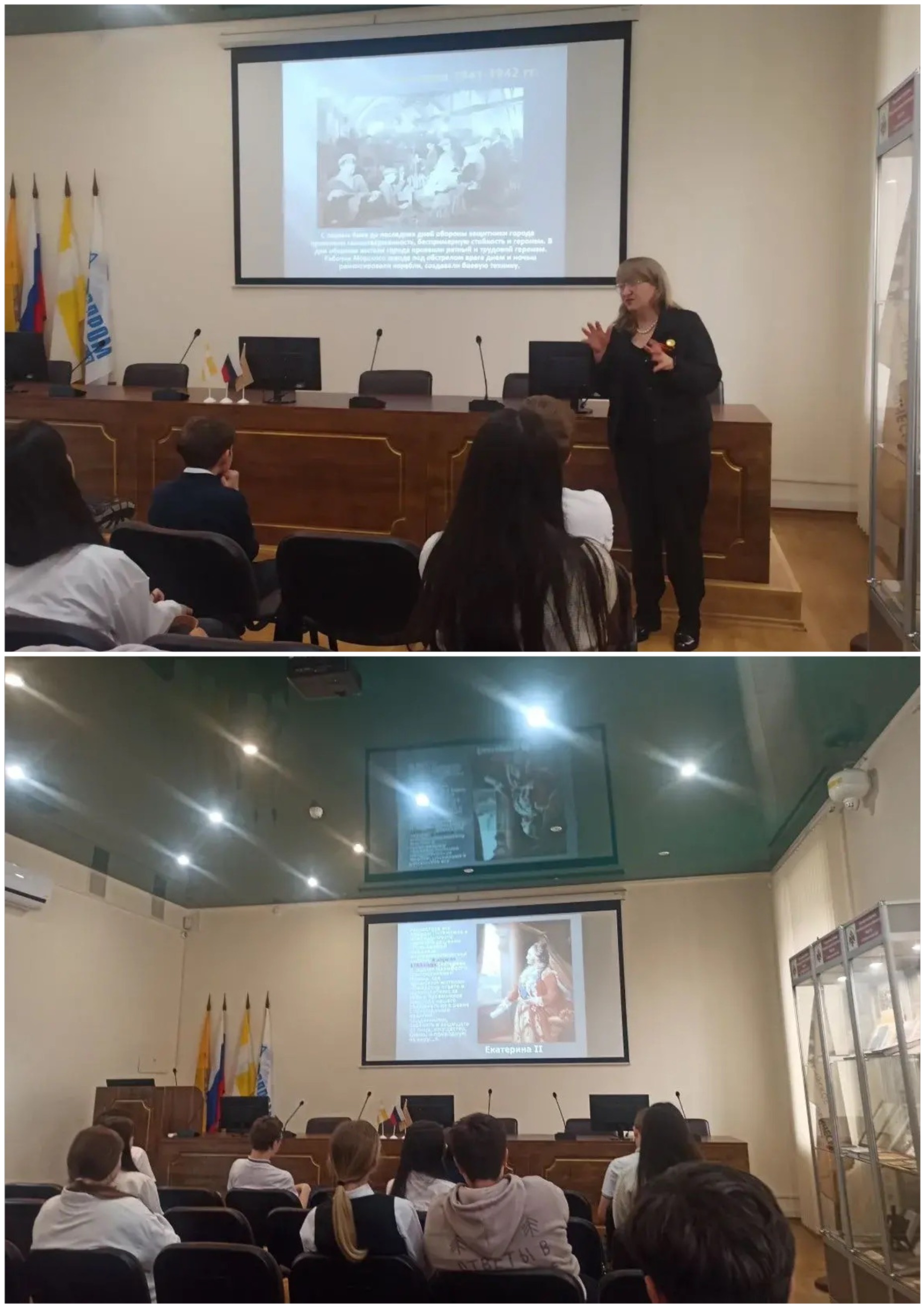 Ведущими докладчиками выступили Стрекалова Е.Н., к.и.н., доцент кафедры истории России России Северо-Кавказского федерального университета (СКФУ), старший научный сотрудник отдела военной истории и патриотической работы СГМЗ, член РО РВИО СК, и Каменева Г.Н., к.и.н., зав. отделом военной истории и патриотической работы СГМЗ, исполнительный директор РО РВИО СК.