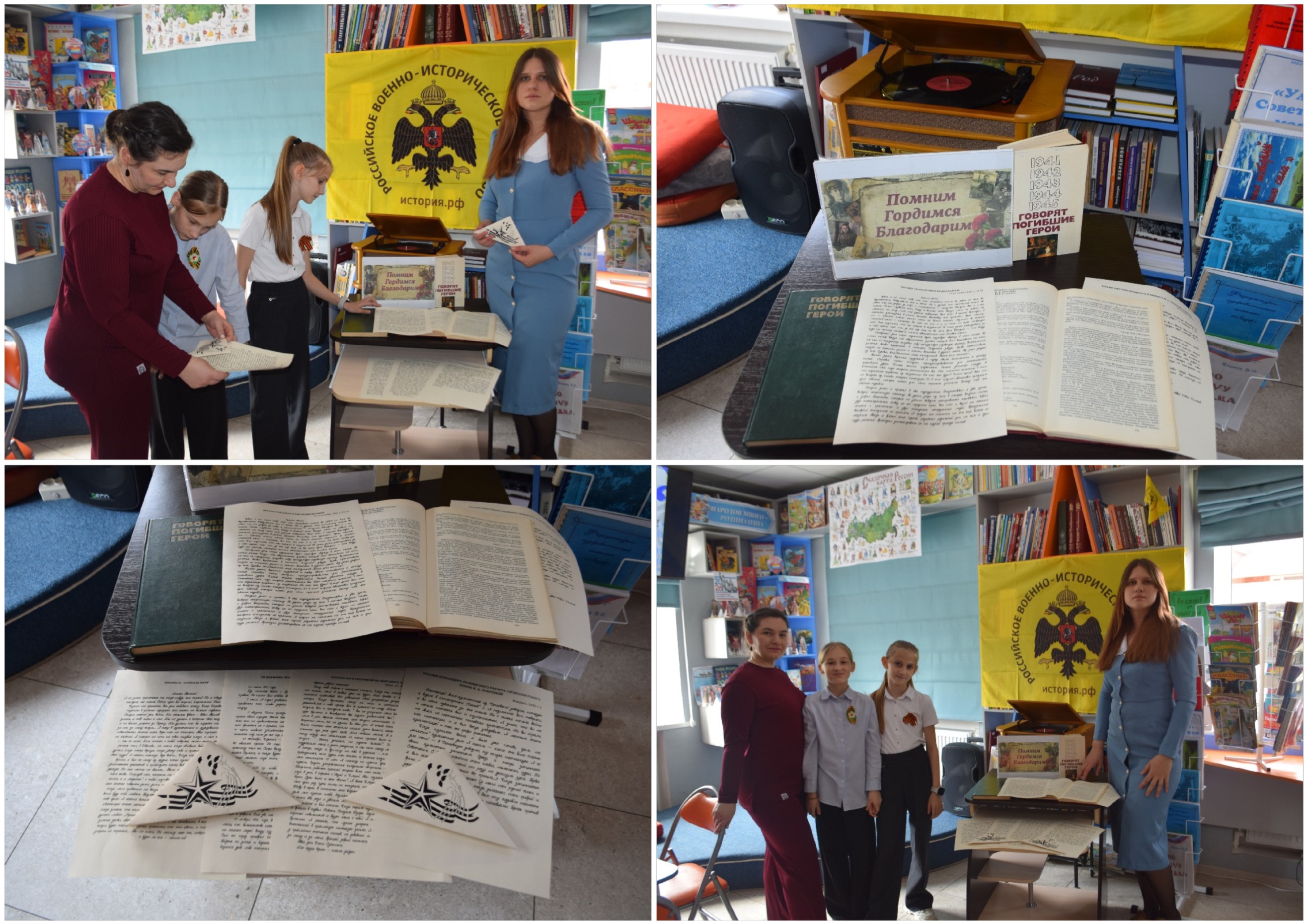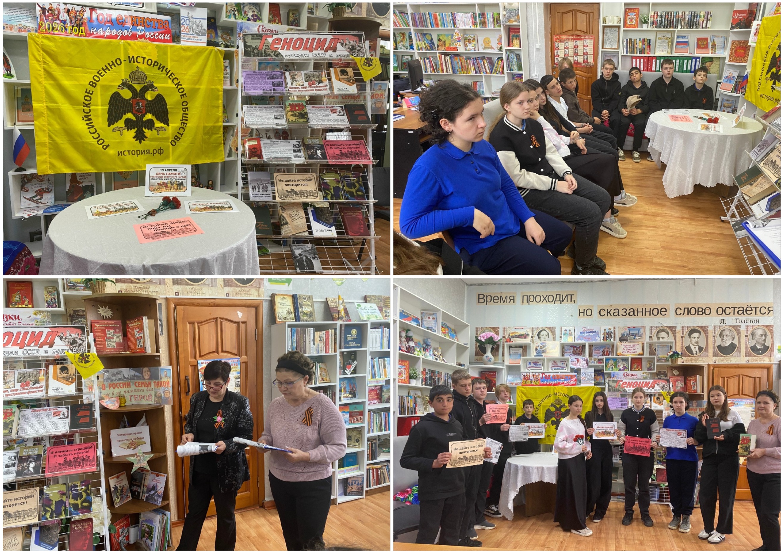 В Грачёвской центральной детской библиотеке (заведующий – Моргунова И.Е., член РО РВИО СК) прошло мероприятие Архив памяти «Страницы, которые помнят». Ребята познакомились с книгой «Говорят погибшие герои». Вся книга – это письма и документы, которые писались в последние минуты жизни в застенках врага, в тюрьмах и концентрационных лагерях, на каторге, в момент тяжёлых боев с фашистскими войсками. Участники прочли письмо А. Голикова жене перед танковым боем, письмо писателя Юрия Крымова жене перед решающим боем в районе с. Богодуховка, письмо смертельно раненного на Смоленщине танкиста И.С. Колосова невесте, строки из дневника ленинградского юноши В.Г. Мантула, письмо Кати Сусаниной из немецкого плена.